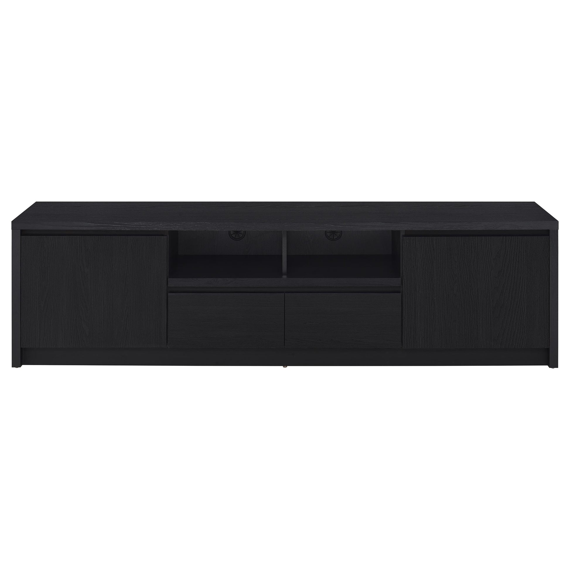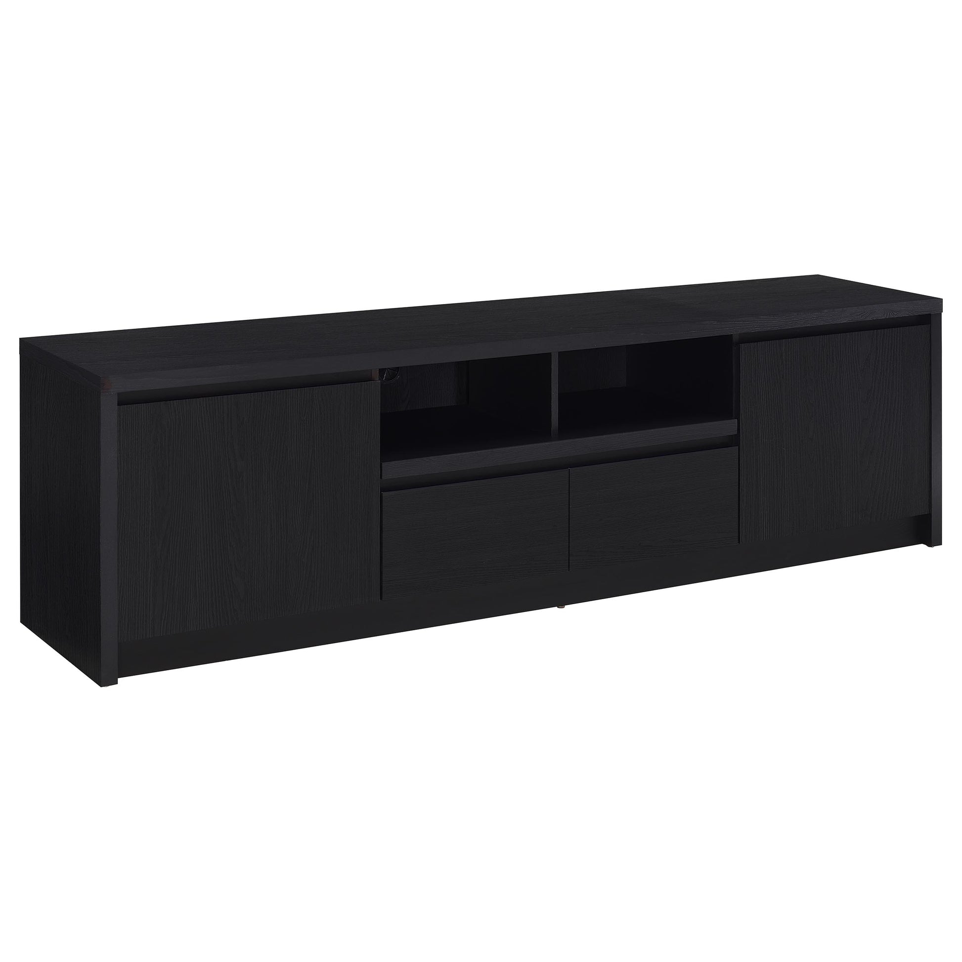 This sleek entertainment center combines a contemporary black finish with practical storage solutions. Made from durable engineered wood, it’s topped with a scratch-resistant eco-friendly laminate veneer. The unit includes two cabinets for concealed storage, an open shelf with a cable management hole for media devices, and a spacious drawer for organization. Its sturdy construction and modern silhouette make it a versatile piece for any entertainment setup.