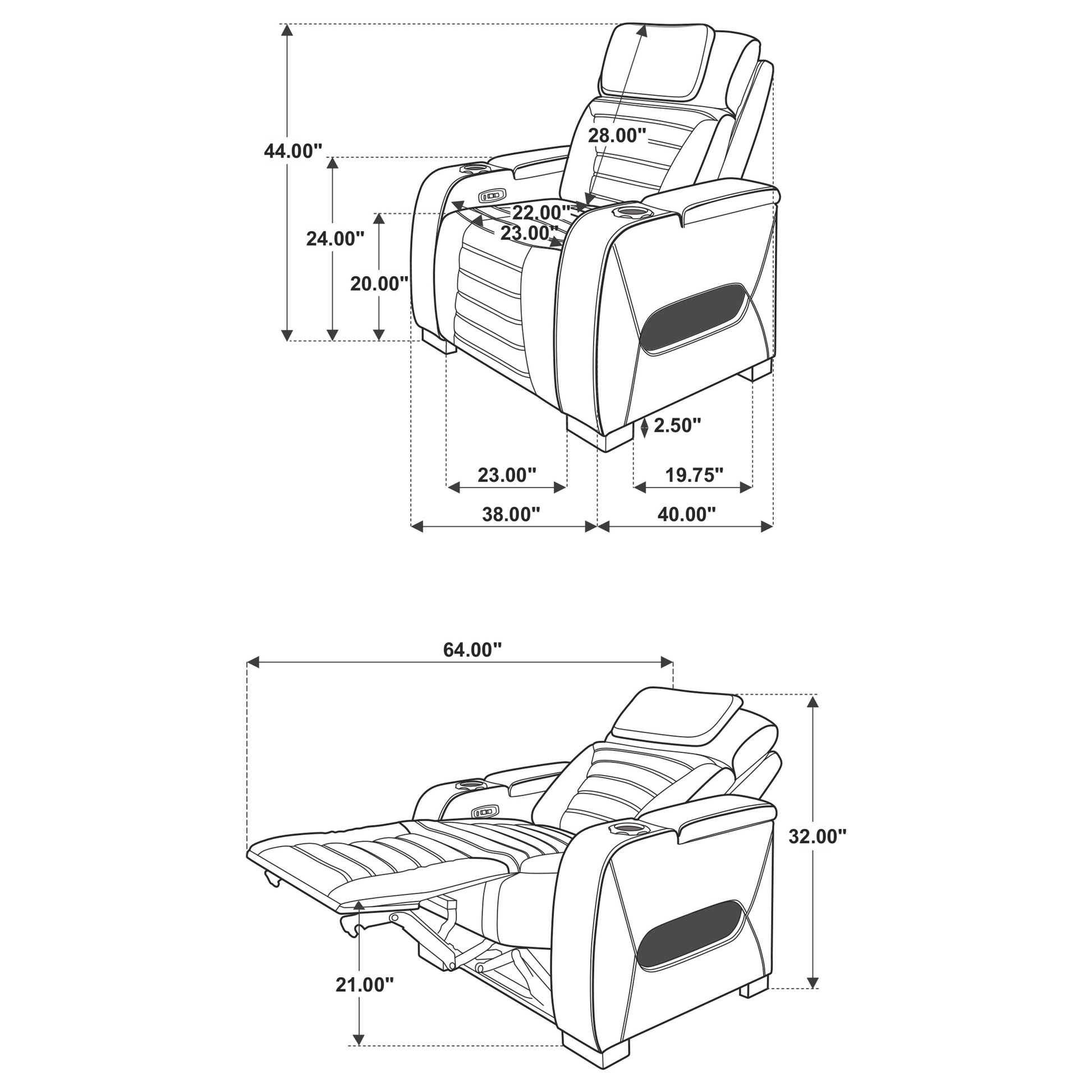 Perfectly sized for solo lounging, this dual power recliner blends tech-forward features with bold modern style. Enjoy power recline and an adjustable power headrest, plus side control panels with USB-A, USB-C, and a home button for seamless comfort. Blue LED under glow lights the base, while sleek cup holders are built into both arms. Upholstered in black leatherette with deep channel detailing, it’s a standout seat for any media room or lounge.